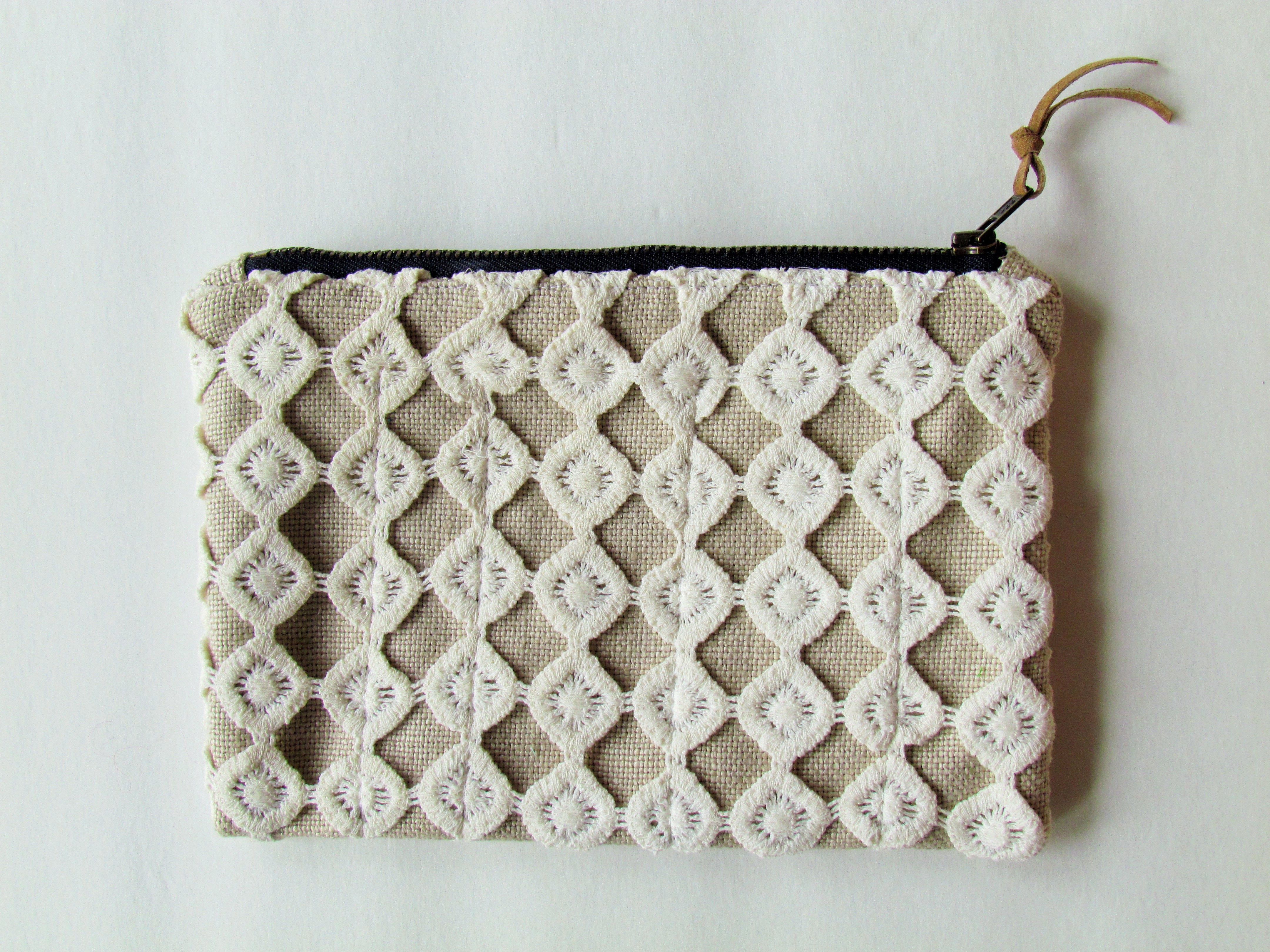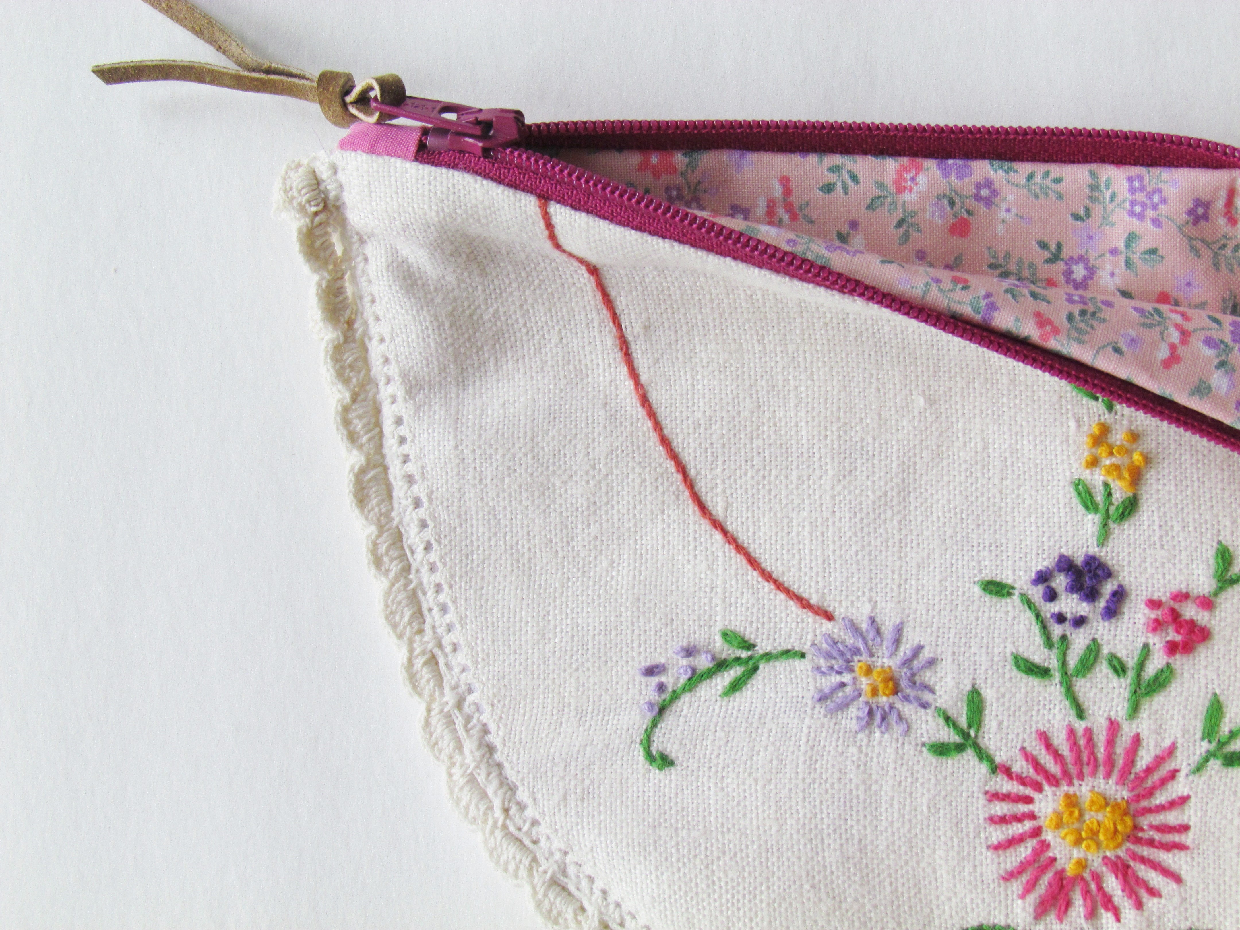 A friend of mine had given me a bag of vintage doilies and linens earlier in the year and I started digging through it to see if there was anything I could upcycle. There was! Some of my favourite were some oval hand-embroidered linen doilies. After cutting them in half (yes it felt a little wrong doing that…) I made a lining of pink floral cotton, fused with interfacing to add some strength and sewed in a colourful zipper. My girls were drooling and I promised I would make them their own fun colourful pouches soon. In the meantime, I ended up making a whole batch from various materials and scraps in my fabric cupboard. I’ll be selling these on my etsy store (www.etsy.com/shop/suzannefaris), I have ideas for more as well so if I get the time you may see some new designs in the next couple of weeks.
