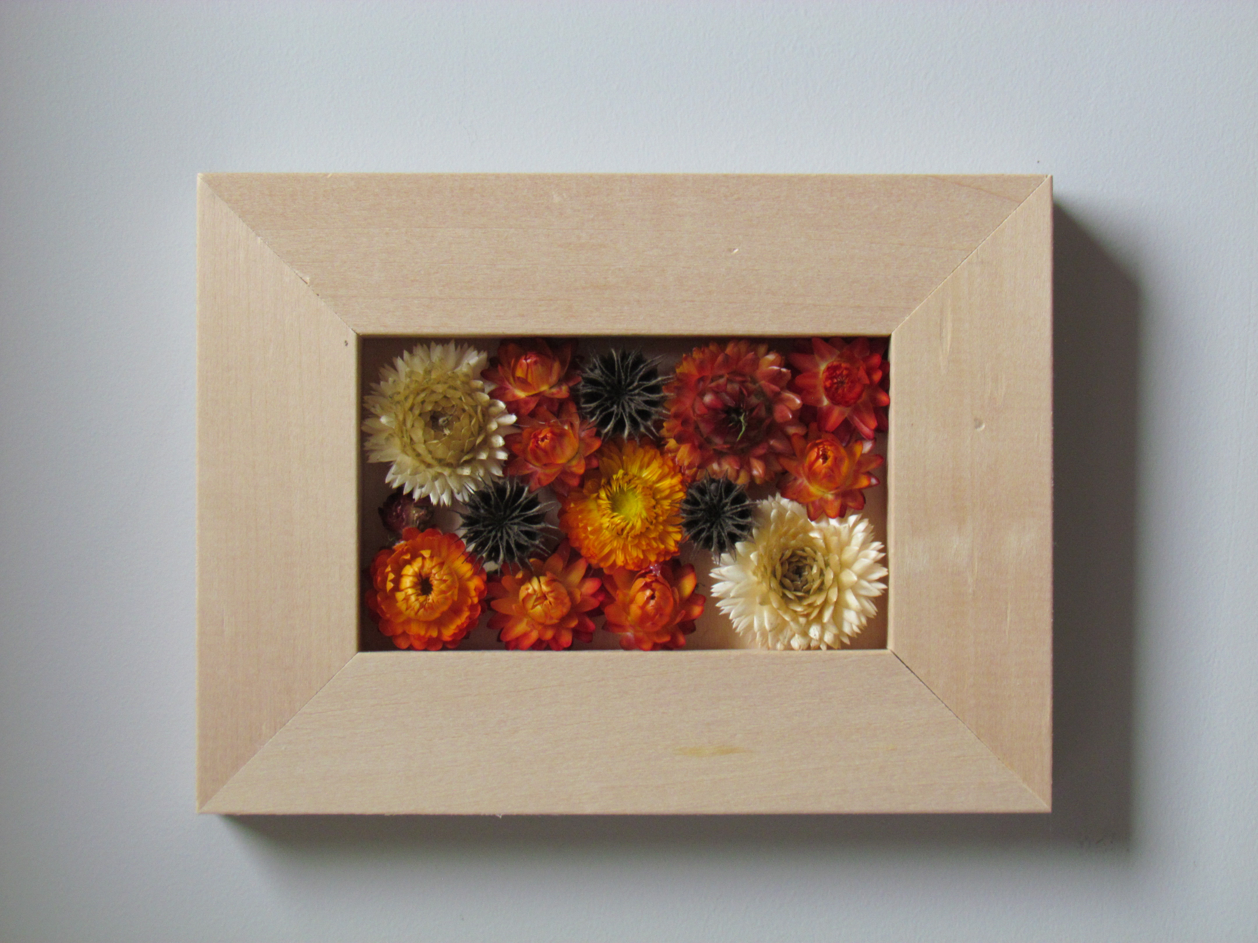 I found a simple frame at the local art store, grabbed my hot glue gun and got to work arranging and fitting them all in. The design reminded me of a wall mount succulent display and I loved the irregularity of the flowers within the uniformity of the frame. Such a simple and quick project. I added a hanger on the back and it was ready to go. Because I had fallen in love with these flowers I found some seeds of my own and grew a little patch in the garden this summer. We’ve been collecting the blossoms and setting them aside to make more pictures. It’s quite a tall plant and there’s much more greenery than flowers but it’s worth it for these little gems!