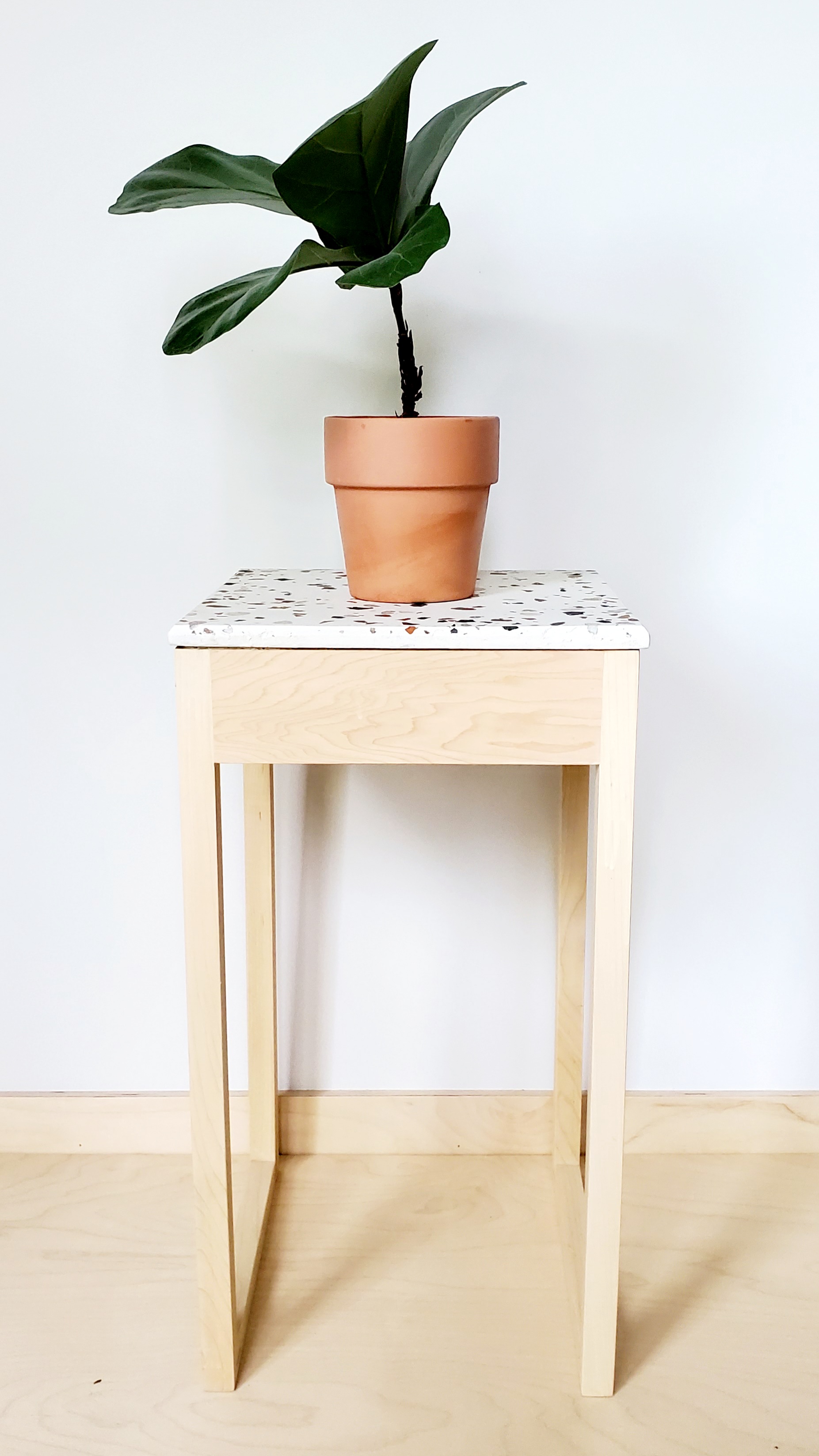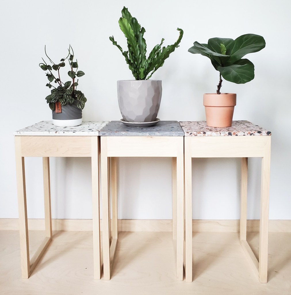 As with many of my projects, the idea for the tables was birthed out of a need in my home. I wanted a matching set of plant tables so I could display a large statement plant on one and a collection of smaller plants on the other. They also needed a top that could handle the water spills that usually happen – hence the terrazzo idea.  I was super lucky to find an amazing sealer at my local supplier. They said it would be invisible to the eye and were they ever right! It’s a milky substance, easy to paint on and it gives the terrazzo a beautiful silky feel. I tested the “waterproof-ness” by leaving a glass in a puddle of water on the tabletop for several hours. The water held in bead form the entire time. It clearly wasn’t going anywhere. They also serve well as side tables or drink tables for the same reason that spills won’t damage the tops. Say goodbye to coasters…