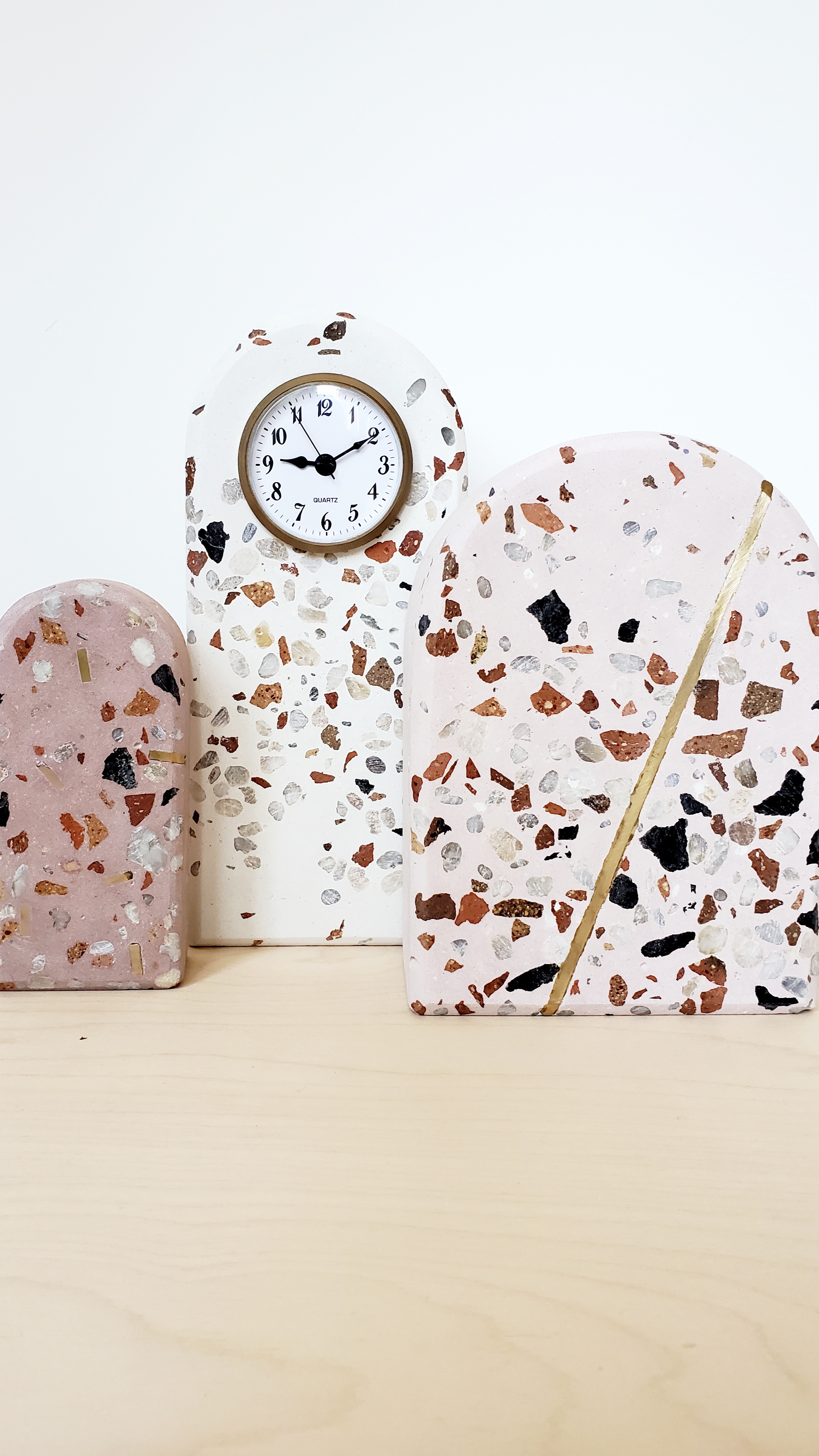 And last but not least, the terrazzo medley. I’m not really sure where the inspiration for this first came. I liked the idea that I could make any shape that I wanted which made me curious to experiment with curves. The online clock shop also had these adorable little clocks that really needed me to come up with a use for them. And I wanted to combine several complimentary terrazzo colours together in one project and test out brass as an accent. So lots of fun things together and… the medley was born. I thought it might make my mantel happy as well. The jars I had displayed there were starting to bore me, haha.