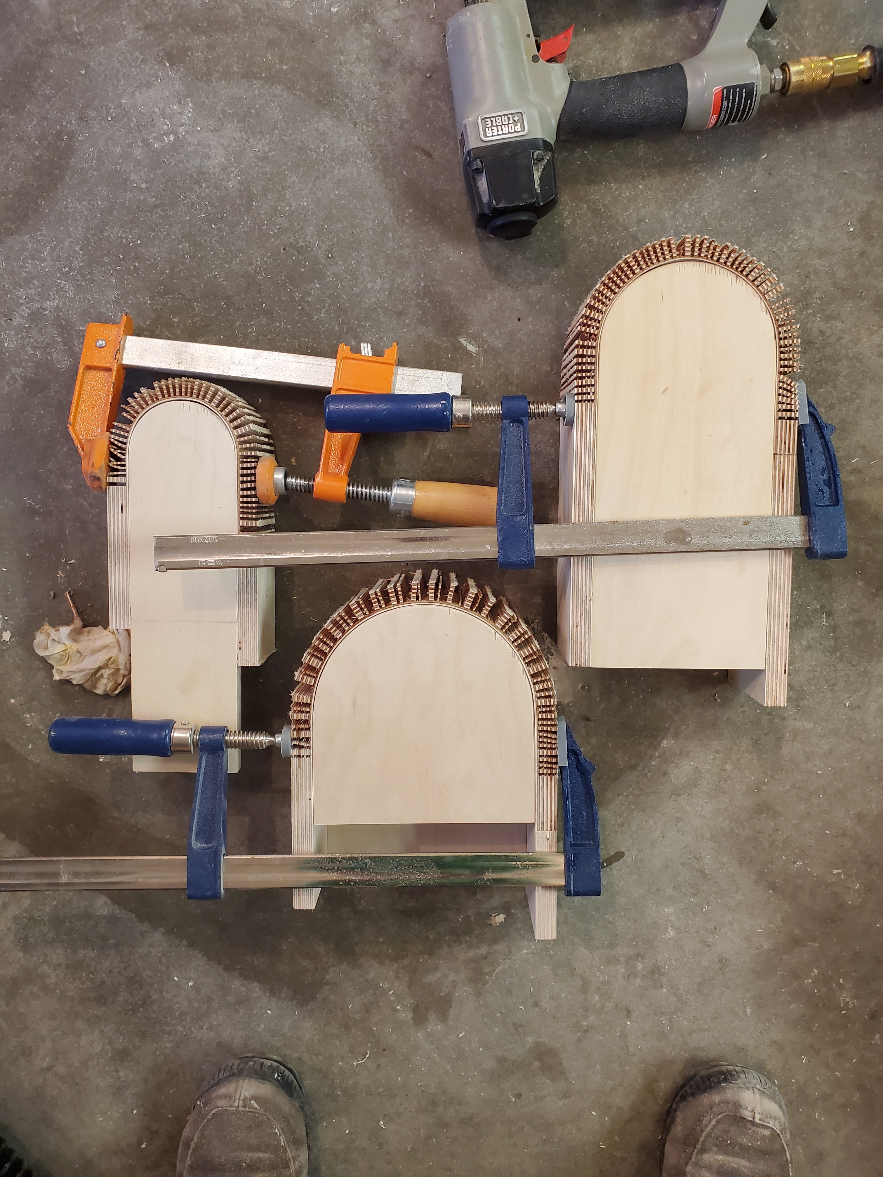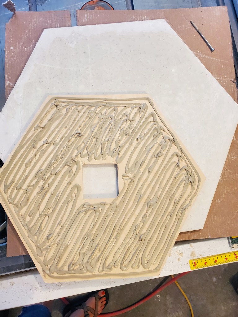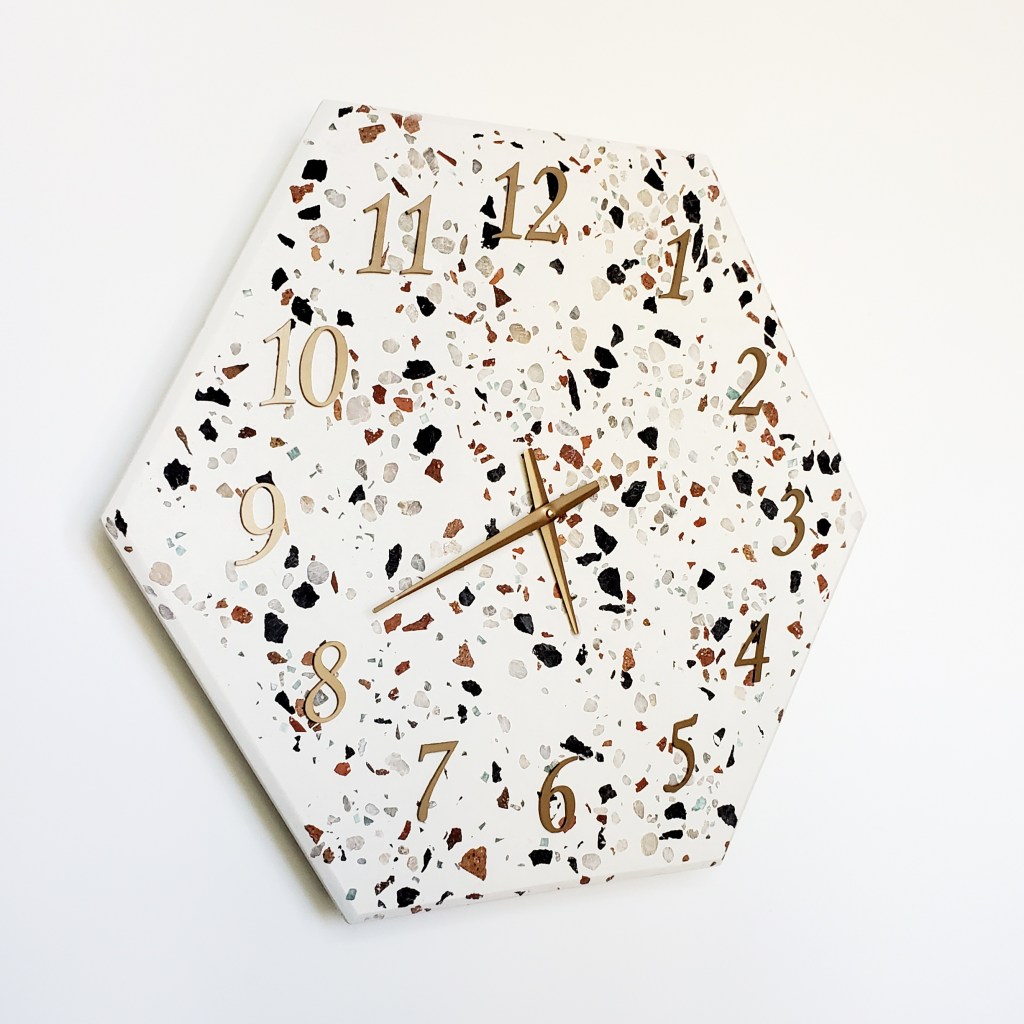 And yes, I needed a big clock in my house so…..terrazzo clock! In an effort to keep it as light as possible, I poured the terrazzo quite thin at just 1/2″ and fully supported the back with a beautiful light wood. My first attempt used metal numbers that were set right in to the terrazzo and ground down level with the rock. While this was pretty awesome, keeping the numbers level was a little more challenging so I made a second with the numbers attached after grinding. They both look great. I love the hexagonal shape. A random geeky shop fact for you, a hexagon is easy made using 30 degree cuts. 🙂