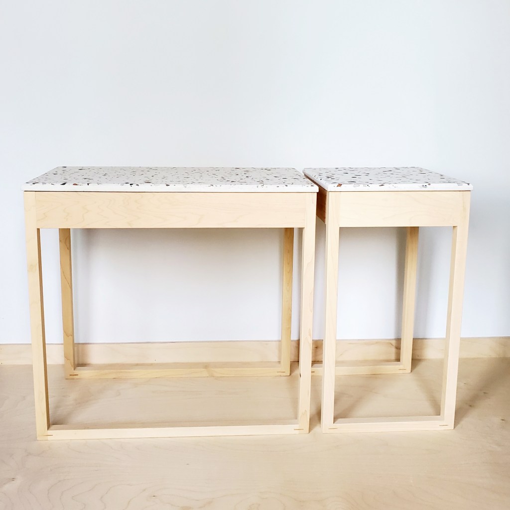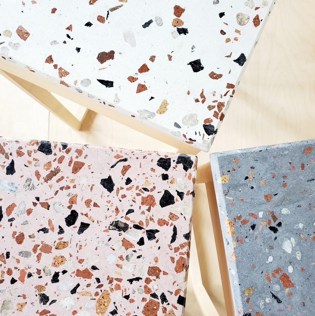 Last week the new terrazzo collection officially launched. An exciting time! Much anticipation and work led up to this point starting a couple years ago when my curiosity with terrazzo first began. Initially the plan was just to do the tables using terrazzo tiles but I struggled to find good sources. I considered using regular glazed tile but with stores closed due to covid there was no way to get my hands on the material before buying. I’m pretty picky when it comes to tile. I was reluctant to let the idea go so I decided to try and make terrazzo myself. In the end it opened up more opportunities to use the medium in new and unexpected ways.Â